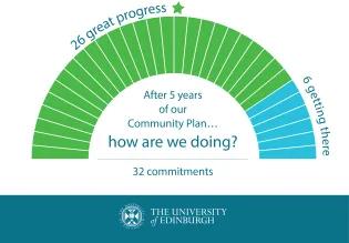 This report summarises progress made since the start of the Community Plan 2020-25, as well as that made in its fifth and final year. Foreword from Lesley McAra, Assistant Principal Community Relations I’m pleased to introduce this final report on our progress in delivering our Community Plan 2020-25, which includes our final instalment of annual reporting for the year November 2024 to October 2025. Advances have only been made through collaboration with a wide range of local partners, their work going hand in hand with that by our staff and students.The Plan launched at the height of the Covid-19 pandemic in November 2020, the impacts of which made stark the varied societal injustices the Plan has, in part, sought to address. Our commitments were pinned down before we knew of Covid-19, but the pandemic did not inhibit our progress: it galvanised our commitment to our local communities and directly catalysed some activity. Professor Lesley McAra CBE, Assistant Principal Community Relations Lesley's introduction, continued Our 32 commitmentsWe’ve made progress on all 32 of our commitments from November 2020, and 26 are where we hoped they would be by October 2025. Milestones have included: The launch of our partnership with IntoUniversity, which includes an education centre in Craigmillar, Edinburgh.Full commitment of £8 million of our funds to social investments.The launch of the Binks Hub, advancing the involvement of local non-professional researchers in research.The launch of Education Beyond Borders, enhancing our support for refugee scholars.Adoption of our Community Access to Rooms scheme, providing free meeting space to almost 200 local community groups.Opening of the Usher and Edinburgh Futures Institute buildings, designed with local partners in mind, and the first fixed location for our veterinary outreach initiative at 127 Nicolson Street, Edinburgh.Our repurposing of Rullion Green Wood in the Pentland Hills Regional Park to enhance its biodiversity, animal habitats and public access.Publication of our wide-scoped Race Review, development of which included robust community engagement. Completion of the Our Edinburgh Neighbourhood project, improving best practice in community planning.We have also seen significant incremental progress on employee volunteering, procurement community benefits, local political engagement, our approach to estates developments, our involvement with flagship Edinburgh festivals, and inclusive access to our sport and exercise facilities. Functions have been created to make it easier for communities to engage with our art exhibitions, heritage collections and the University at large.Work in progressThere are still a handful of commitments yet to be fully realised. Like many other UK universities, we are currently facing financial challenges. Covid-19 also impacted our workforce. Some staff roles or the context have evolved, or ambitions have grown. Our processes to share resources with communities are often ad hoc, limiting scale.Realisation of some of our plans for large-scale opportunities for students to get involved with community engagement as part of their studies are, at least for now, paused. Our plans to involve local alumni in our work are still in development. The Scottish University Community Network has not met in several years, but was a useful way to create connections between universities working in this area. Our Race Review has been completed and recommendations made, but our response is still being developed. We have expanded support for youth employment, but this is yet to translate into the growth we would like in opportunities such as apprenticeships. Continuation of work to progress these commitments is in scope of the Community Plan 2025-30, which is already in motion.RetirementIn the next few months (spring 2026), I will be retiring from the University and consequently will end my term as Assistant Principal Community Relations. As an academic, I have always had a strong belief in the capacity of the University to be a force for social good. And in all of the many leadership roles I have taken on over my career, I have always sought to further the University’s civic commitments. In the ten years since my colleagues and I obtained approval for the University’s very first Community Plan, I have been delighted to witness so much collaborative progress and I am deeply proud to have worked with so many wonderful colleagues in the Department for Social Responsibility and Sustainability, Communications and Marketing, across the three Colleges and beyond. My colleagues will continue to work in partnership to create real change that communities in Edinburgh, Lothians, Fife and Borders want to see: a University in, with and for our local community. Lesley McAra CBE, Assistant Principal Community Relations Our progress 1. Support social impact Including fully committing £8 million in social investments. 2. Share knowledge and experience We made significant donations to local charities and communities. 3. Build close connections We’ve played an active role in the political life of our region at various levels. 4. Provide services to our communities We had a record number of Career Ready volunteer mentors. 5. Open up our estate We’ve improved local green spaces for communities. What's next: Community Plan 2025-30 The Community Plan 2025-30 has been shaped by 18 months of conversations with local communities, staff and students. Building on the significant progress we made during our 2016-20 and 2020-25 Plans, the new Plan commits the University to supporting community-driven change that improves the lives of people living in Edinburgh, the Lothians, Fife and Scottish Borders. Informed by the University’s strengths, the Plan has three priorities for action:Partnering for positive social impactPromoting equalities, now and in the futureThriving communities Read our Community Plan 2025-30 Get involved University staff: Endorse 